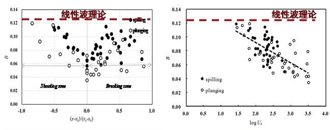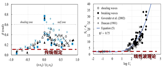 图1.1.4 第三类布拉格共振的水槽试验及正弦地形布设 图1.1.5 第三类超谐波布拉格共振透射系数随入射波波数变化(左)与透射波沿程演化(右) 揭示了沙坝地形上强非线性波浪的波形系数(1/20~1/8)和波峰面坡度(0.1~0.8)显著偏离理论值且与厄塞尔数呈线性和指数型关系,诠释了波浪变形产生的波生流时均压强梯度是引起底部边界层余流“层内向岸、层外离岸”和“浅化区向岸、破波区离岸”形态转化的成因。 图1.1.6 波形系数的沿程变化及其与厄塞尔数的关系 图1.1.7 波峰面坡度的沿程变化及其与厄塞尔数的关系 |
