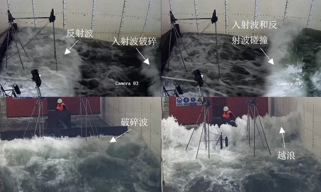 | 珊瑚礁海岸波流动力与岛礁防浪建筑物的相互作用机制 基于1:10大比尺波浪水槽试验,发现了岛礁防浪建筑物抬升前沿水位(最大可达5倍)和减小波浪传播速度(25~30%)的礁坪阻水效应,阐明了破波水流冲击是防浪建筑物结构受力的主控因素,得到越浪量随波浪要素、礁坪水深和建筑物位置的指数型变化规律。提出了筑堤珊瑚礁海岸的波浪增水、建筑物越浪量和胸墙波浪力的计算新公式,克服了基于缓坡地形的现有规范公式不适用于珊瑚礁海岸的缺陷,为岛礁防浪建筑物选址及结构型式优化提供了技术支撑。 图3.1.1 筑堤珊瑚礁防浪建筑物越浪受力大比尺水槽试验