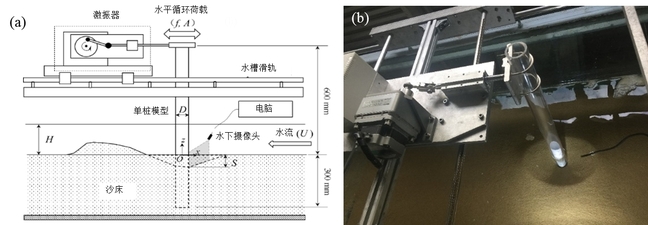 | 多元动力荷载联合作用下的海上风机单桩基础冲刷机理 开展了水流和水平循环荷载共同作用下的海上风机单桩基础冲刷物理模型试验,发现以往所忽略的桩顶水平循环振动会引发桩基周围土体沉降和对流现象,使得初始阶段冲刷率增大9~30%、最大冲刷平衡深度降低5-13%、冲刷坑边坡倾角减小8~13°。 图3.3.1 试验装置示意图(左)与现场照片(右)