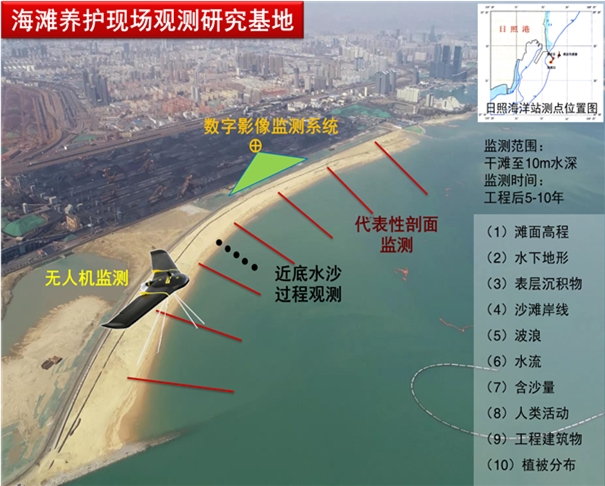 | 海岸带保护修复工程中的水沙运动新机制 建立了海滩养护现场观测研究基地,自主研发了海岸带岸基数字影像监测系统(COSVIMS)和中国近海高精度波浪数据库(CWAVE)。 图3.4.1 海滩养护现场观测研究基地示意图